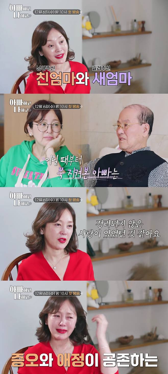 이승연은 "어릴 때부터 내 눈으로 본 아빠는, 정리되지 않은 사랑이 있던 것 같다. 친엄마에 대한"이라고 고백했다.
