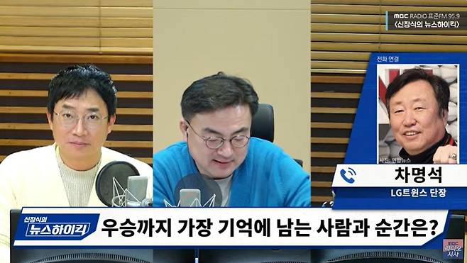 ◎ 진행 > 여기서 소위 LG트윈스, LG트윈스 저희 MBC하고도 관련이 있습니다. MBC청룡에서 LG트윈스로 넘어갔죠. MBC청룡 LG트윈스의 명단장 차명석 단장님 연결해서 축승연 하고 계시다고 하는데요. 그쪽 분위기까지 한번 알아보도록 하겠습니다. 단장님 나와 계시죠?