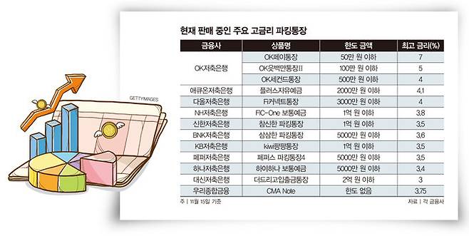 KB저축은행의 'kiwi팡팡통장'은 1억 원까지 최대 연 3.5% 금리가 제공되는 모바일 전용 파킹통장이다. 기본금리는 1억 원 이하 연 3%, 1억 초과 1.3%다. 우대금리는 0.5%로 kiwi멤버십 또는 마케팅 수신 동의(0.2%), 자동이체 2건 이상 출금 거래 등록(0.1%), kiwibank 앱을 이용해 월 1회 이상 계좌이체(0.2%) 등을 충족하면 된다.하나저축은행의 '하이하나 보통예금'은 기본금리 2.9%에 우대금리 0.5%를 포함해 연 최고 3.4% 이자를 지급한다. 우대금리는 개인(신용)정보 수집·이용 제공 동의 및 상품서비스 안내수단 전체동의(0.1%), 월말 잔액 30만 원 이상 100만 원 미만(0.1%)·100만 원 이상 200만 원 미만(0.2%)·200만 원 이상(0.3%), 종이통장 없는 계좌 이용 시(0.1%) 등이며 최대 5000만 원까지 적용된다.