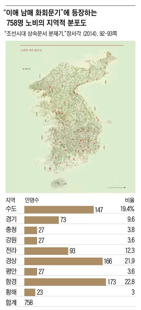그렇다면 정부 집계로 온 나라 전 인구가 고작 3~4백만 명(1519년 374만 명 정도)에 불과했던 15세기 말 조선에서 과연 어떻게 한 집안이 758명의 노비를 소유할 수 있었을까? 이 난해하고도 중요한 질문에 대해선 연구자들에 따라 해석이 분분하다. 이 큰 질문은 잠시 미뤄두고 일단 이 문서에 등장하는 노비들이 과연 누구였는지, 어떤 사람들이었는지 우선 살펴보자.