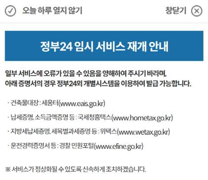 한편 정부는 장애가 발생한 다음날인 18일 오전 온라인으로 민원서류를 신청·발급받을 수 있는 '정부24' 서비스를 임시 가동했다. 이에 앞서 '지방행정전산서비스 장애 대책본부'를 꾸리고, 대전 국가정보자원관리원에 공무원과 기업 직원 등 100여명을 투입해 복구작업을 시작했다. 다만 아직 '새올' 시스템은 정상화되지 않은 상태로, 웹서비스인 정부24부터 먼저 가동했다. 정부24에서는 행정전산망 마비 사태 이전에 제공했던 민원 서비스 총 1327건이 모두 제공되고 있다. 주민등록등본 등 증명서 발급서비스 887건, 보육·양육수당 신청 등 신청서비스 171건, 전출·전입신고 등 신고서비스 188건, 그밖에 조회서비스 81건 등이다. 안경애기자 naturean@dt.co.kr