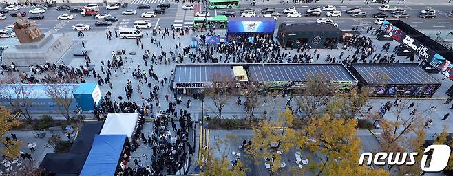 (서울=뉴스1) 박정호 기자 = 롤드컵 결승전을 하루 앞둔 18일 오후 서울 광화문 광장에서 진행 중인 2023 롤드컵 팬 페스트가 게임 팬들로 북적이고 있다.