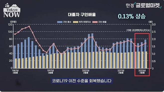 종합상사와 메가뱅크조차 신입사원의 임금인상 경쟁을 벌일 정도로 심각한 일본의 인력난은 어느 정도일까. 리크루트웍스연구소에 따르면 2024년 3월 대학 졸업 예정자의 구인배율은 1.71배로 2023년 졸업자의 1.58배보다 0.13포인트 상승했다. 코로나19 이전 수준을 회복했다.