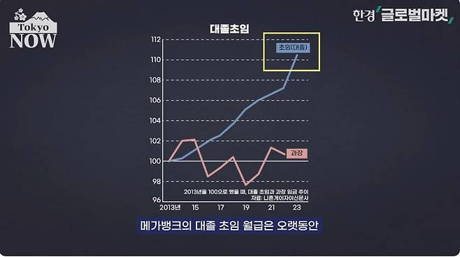 만년 정체상태이던 일본의 임금수준을 변하게 만든건 인력난이다. 메가뱅크 2위 미쓰이스미토모은행은 2023년 입행 대졸자들의 초임을 25만5000엔으로 5만엔(24%) 올렸다. 미쓰이스미토모은행이 임금을 올린 건 16년 만이다.