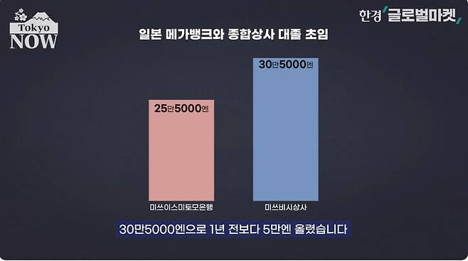 일본 3대 메가뱅크(초대형 시중은행)는 전통적으로 문과 출신 졸업생들이 가장 선호하는 직장 가운데 하나다. 메가뱅크의 대졸 초임 월급은 오랫동안 20만엔(약 181만원) 수준에 묶여 있었다. 다른 업종의 초임 수준도 크게 다르지 않다. 인사원에 따르면 2022년 4월 민간 기업의 대졸 사무직 평균 초임은 20만7878엔(약 188만원)이었다.