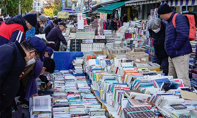 어린아이처럼 호기심 가득한 눈망울로 책 무더기를 살펴보는 사람들.
