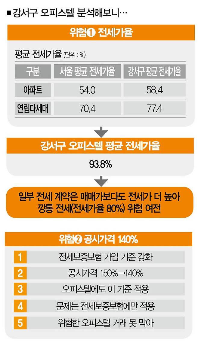 ■ 숨은 위험➊ 전세가율 = 오피스텔 전세가율을 확인하기 전에 범위를 한정해보자. 서울에서 전세보증보험 사고가 가장 빈번하게 일어난 곳은 강서구였다. 2022년 8월부터 정부가 나름대로 전세사기 대책을 내놨던 2023년 4월까지 서울에선 총 2626건의 전세보증 사고가 터졌는데, 그중 27.2%인 715건이 강서구에서 발생했다.