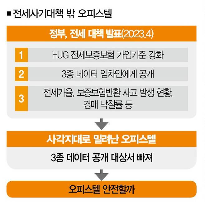 물론 정부가 전세보증보험에 가입하지 않은 임차인을 방치하고 있는 건 아니다. 20 23년 6월 발족한 전세사기피해지원위원회를 통해 전세사기 피해자로 입증될 경우 소득ㆍ전세보증금 등을 기준으로 전세대출 지원이나 법률 지원을 받을 수 있다. 오피스텔도 마찬가지다.