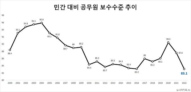 지난해 민간 대비 공무원 보수 수준이 역대 최저인 83.1%를 기록한 것으로 확인됐다.
