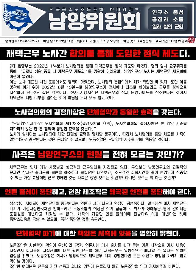 전국금속노동조합 현대차지부 남양위원회(남양연구소 노조)는 회사가 재택을 폐지한다는 언론보도에 대해 강력 반발하고 나섰다. 노조는 소식지를 통해 "재택근무는 현재 가장 성공적인 근무 형태로 고질적 문제인 장시간 출퇴근 불편을 해소하고 불필요한 대면보고, 소모적 회의 시간을 줄여 본 업무에 집중할 수 있게 한다"며 "조합원들은 회사의 거짓 선동과 계략에 흔들리지 말고 노조를 믿고 지지해달라"고 덧붙였다.
