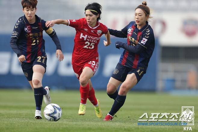 전반 초반부터 인천 현대제철 남궁예지가 빠른 전방쇄도로 골을 향한 의지를 불태웠다. 초반 양팀의 일진일퇴가 이어졌다. 전반 12분 드리블로 박스안을 쇄도하고 들어간 인천 현대제철 캡틴 김혜리의 크로스가 옆그물을 흔들었다. 전반 17분엔 수원FC 위민 '2년 연속 리그 득점왕' 문미라의 슈팅이 굴절되며 불발됐다. 이어진 김윤지의 슈팅은 높이 떴다.