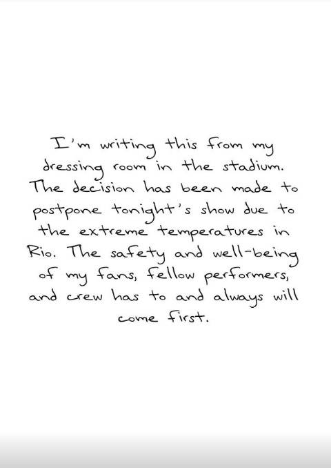 테일러 스위프트는 18일(현지 시간) "나는 경기장에 있는 분장실에서 이 편지를 쓰고 있다. 리우데자네이루의 극심한 기온 때문에 오늘 밤 공연을 연기하기로 결정했다. "내 팬들, 댄서들, 그리고 크루들의 안전을 항상 우선시할 것"라고 알렸다.