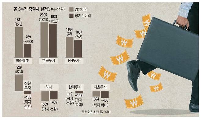 올해 2분기 차익결제거래(CFD) 미수금과 부동산 프로젝트파이낸싱(PF) 부실화의 충격을 간신히 넘겼던 증권사들이 3분기에도 시장 눈높이에 못 미치는 실적을 거뒀다. 각종 충당금 적립에 따른 이익 감소에 더해 고금리에 따른 채권평가손실 악재까지 겹쳤기 때문이다. 특히 고금리 지속에 따른 조달 여건 악화와 수익성 저하로 부동산 시장 침체가 지속되면서 투자은행(IB) 부문 이익이 큰 폭으로 줄었다.
