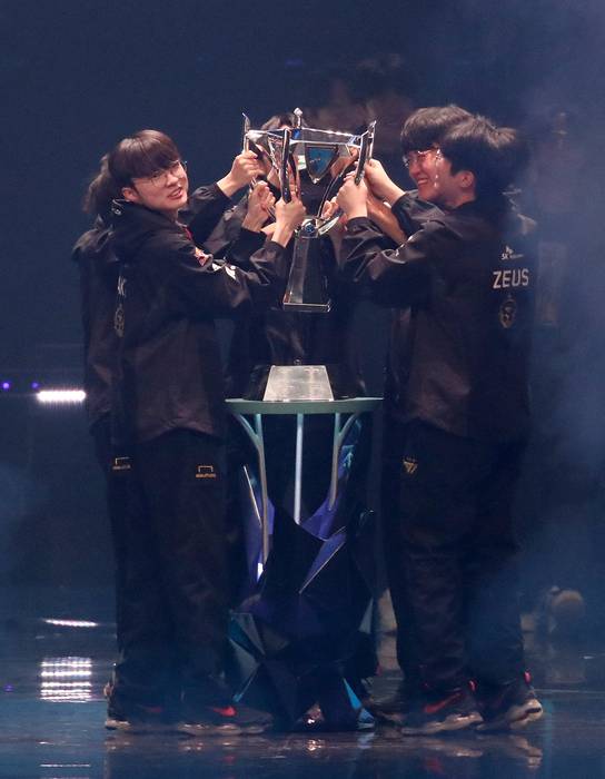19일 오후 서울 구로구 고척스카이돔에서 열린 2023 리그 오브 레전드(LoL) 월드 챔피언십(롤드컵) 결승전 T1과 웨이보 게이밍의 경기에서 3-0으로 우승한 T1 선수들이 기뻐하고 있다.〈사진공동취재단〉