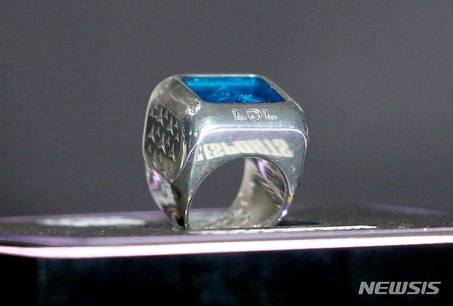 [서울=뉴시스] 사진공동취재단 = 19일 서울 구로구 고척스카이돔에서 열린 '2023 리그오브레전드(LoL·롤) 월드 챔피언십 결승전' 대한민국 T1과 중국 웨이보 게이밍의 경기에서 우승을 차지한 T1이 받은 우승 반지. 2023.11.19. photo@newsis.com