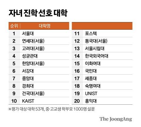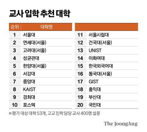 교사들이 꼽은 입학 추천 대학은 서울대가 1위였다. 이어 2위 연세대, 3위 고려대, 4위 성균관대, 5위 한양대, 6위 서강대, 7위 중앙대 순이다. 학부모가 답한 자녀 진학을 선호하는 대학 순위도 7위까지 동일했다.