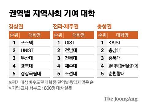 공통적으로 지역거점국립대보다 이공계특성화대의 순위가 더 높았다. 과학 인재 배출에 특화된 이공계특성화대학이 대한민국 발전 뿐만 아니라 지역에도 기여한다는 인식이 높은 것으로 보인다. 1995년에 개원해 전라·제주권에서 젊은 대학에 속하는 GIST는 지난해 3위에서 올해 1위로 도약했다. 김재관 GIST 대외협력처장은 “학교 특성을 살린 과학 강연 프로그램이나 청소년 멘토링, 음악회 등 다방면의 지역사회 공헌 활동 덕분”이라고 말했다.