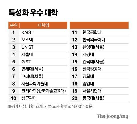 특성화를 잘 한 대학을 묻는 설문에선 서울과학기술대(8위), 한국공학대(옛 한국산업기술대·11위)가 좋은 평가를 받았다. 교명을 바꾸고 산학협력 등을 강화하면서 인지도가 높아진 것으로 분석된다. 김수민 한국공학대 기획처장은 “학부모 간담회와 기업참여 잡페어 행사에 가보면 학생, 학부모, 기업들의 만족도가 높아졌음을 실감하고 있다”며 “미래 첨단 산업에 특화된 융합전공을 강화하는 등 특성화를 추진한 성과도 반영됐다”고 말했다.