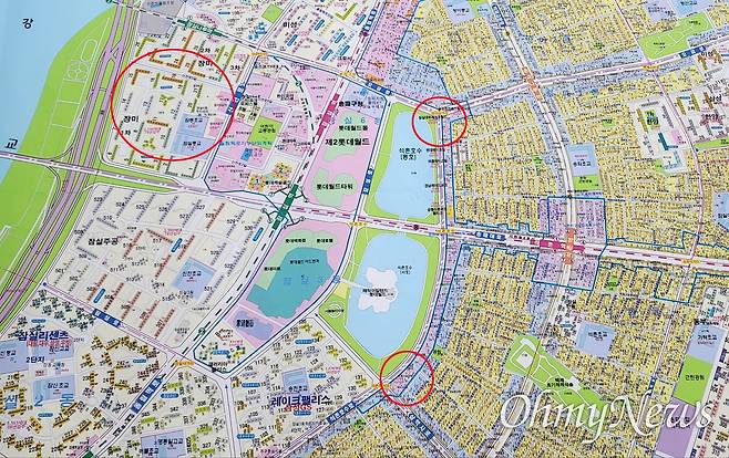 | ▲ 석촌 호수 인근 지역도. 과거 최은순씨는 석촌호수 근처에서 포장마차 사업을 운영한 것으로 알려져 있다. 석촌 호수를 중심으로 장미아파트(북서쪽), 잠실대우레이크월드아파트(북쪽) 등에서 최씨가 거주했던 기록이 나타난다. 석촌동 1-○번지는 사진 하단 원표시. |