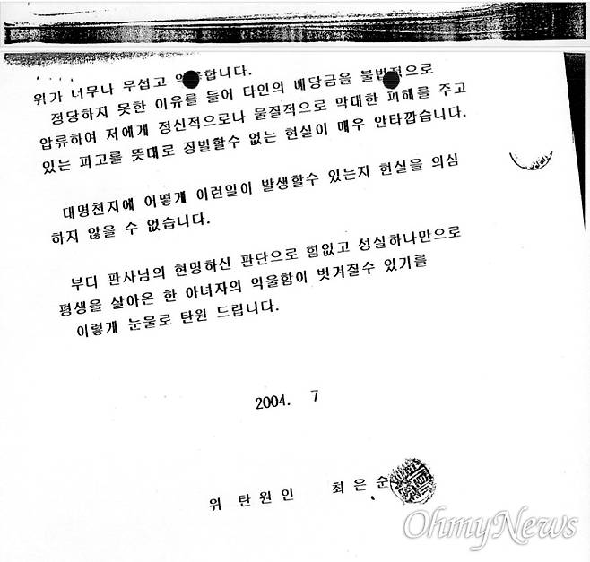 "17년 전 모두가 어려웠던 시절. 젊은 나이에 박봉의 공무원이었던 남편을 졸지에 여의고 어린 4남매를 부둥켜안고 가난과 절망으로 인해 눈물로 지새웠던 날들이 주마등처럼 스쳐갑니다." (2004년 탄원서)