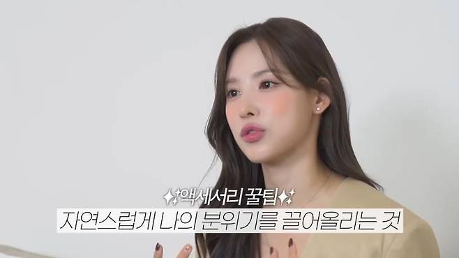 향기도 사람의 분위기의 일부! 좋은 향수를 뿌리면 기분도 좋아지고 그 사람의 분위기도 형성되는 법이다. 나연이 추천하는 취향별 향수는? 플로럴 향과 여성스러움을 강조하고 싶다면 ‘미스 디올 블루밍 부케,’ 중성적인 향을 원하면 ‘셀린느 렙틸,’ 유니크와 상큼한 느낌을 찾고 있다면 ‘메모파리 마두라이’와 ‘구딸 파리 뒤엘 오 드 퍼퓸’을 참고해 볼 것. 또 나연은 액세서리로 고급스러운 분위기를 연출할 수 있는 무기라고 한다. 화려한 디자인이 아니더라도 베이직한 링, 진주나 얇은 목걸이로도 분위기 한층 업 가능!