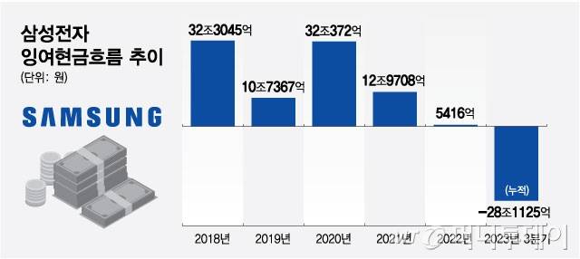 20일 에프앤가이드에 따르면 삼성전자의 올해 3분기 누적 잉여현금흐름은 28조1125억원 적자로 나타났다. 4분기 극적인 실적 개선이 없는 이상 올해 잉여현금흐름은 순유출로 마무리 될 가능성이 높다. 삼성전자의 잉여현금흐름이 마이너스를 기록한 것은 2009년 IFRS(국제회계기준)를 도입한 이후 처음이다.