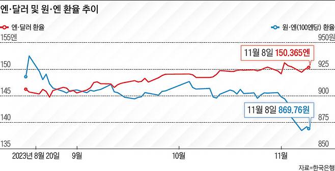 엔화 가치는 10월 들어 달러당 150엔으로 떨어지더니, 한 달째 회복하지 못하고 있다. 11월 들어선 152엔에 육박하면서 오히려 엔저가 심화하는 양상이다. 1990년 이후 33년 만의 최저 수준에 근접한 것이다. 폭락한 엔홧값은 원화와 비교해서도 힘을 쓰지 못하고 있다. 원·엔 재정 환율은 11월 6일 100엔당 867원으로 주저앉으며, 2008년 이후 최저치를 기록했다.