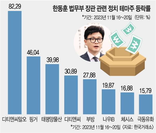 사외이사가 한 장관과 서울대 법대, 컬럼비아대 로스쿨 동문이라는 이유로 ‘한동훈 테마주’가 된 디티앤씨알오는 20일 전 거래일 대비 14.55% 오른 6690원에 마감했다. 최근 사흘간 주가 상승률은 82.29%다. 핀테크기업 핑거의 주가도 같은 기간 46.04% 상승했다. 핑거 역시 사외이사직에 한 장관의 서울대 법대 동문이 있다는 이유로 테마주로 분류됐다.