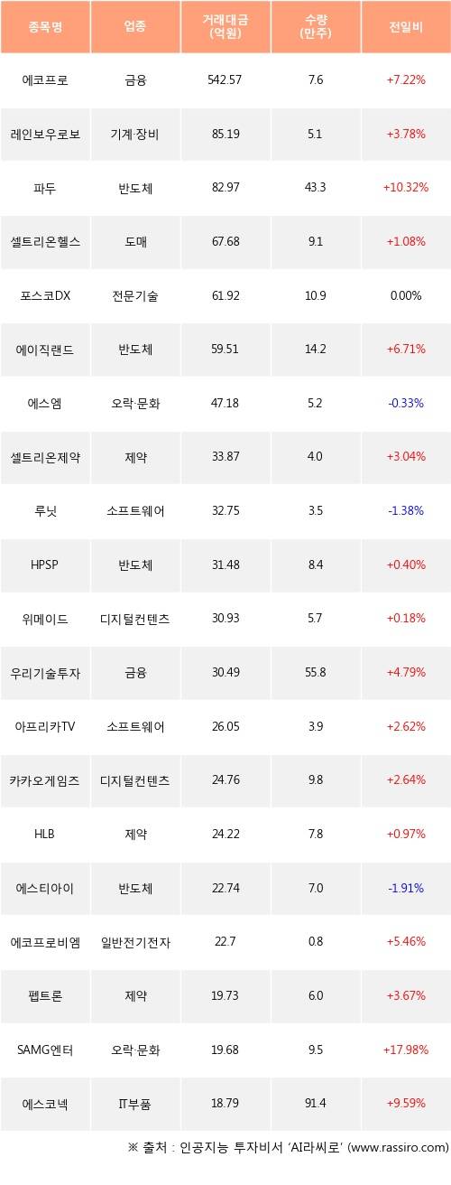 에코프로, 레인보우로보틱스, 파두 등은 전일 대비 주가가 상승했고, 에스엠, 루닛, 에스티아이 등은 주가가 하락했다.