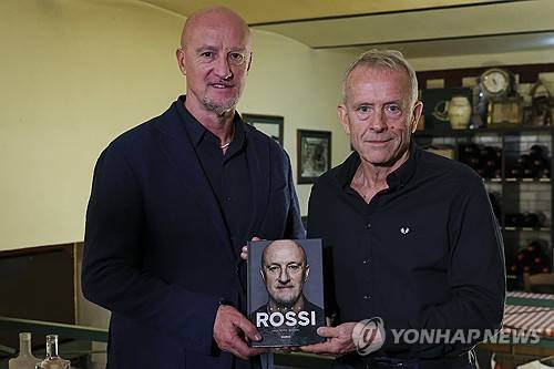 epa10985873 Head coach of the men’s national soccer team of Hungary Marco Rossi (L) and author Andras Ch. Gall launch Rossi's latest biography entitled ’Marco Rossi - Carry on, Mister!’ in a restaurant in Budapest, Hungary, 20 November 2023. The book, authored by ethnic Hungarian writer and journalist Andras Ch. Gall, is a follow-up of a 2018 book on head coach of the men’s national soccer team of Hungary Marco Rossi. The 59-year old trainer was awarded the Coach of the Year title and acquired Hungarian citizenship in 2023. EPA/Robert Hegedus HUNGARY OUT