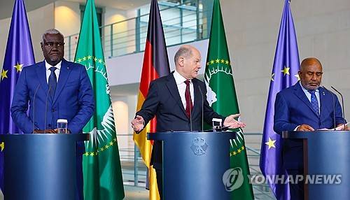 epa10985944 German Chancellor Olaf Scholz (C), Chairperson of the African Union Commission Moussa Faki Mahamat (L) and Chairperson of African Union (AU) and President of the Comoros Azali Assoumani (R) attend a news conference during the Compact with Africa (CwA) conference at the Chancellery in Berlin, Germany, 20 November 2023. The 'Compact with Africa' is an initiative that was launched in 2017 under the German G20 presidency. It aims to bring together reform-minded African countries, international organizations and bilateral partners to coordinate development agendas and discuss investments. EPA/HANNIBAL HANSCHKE