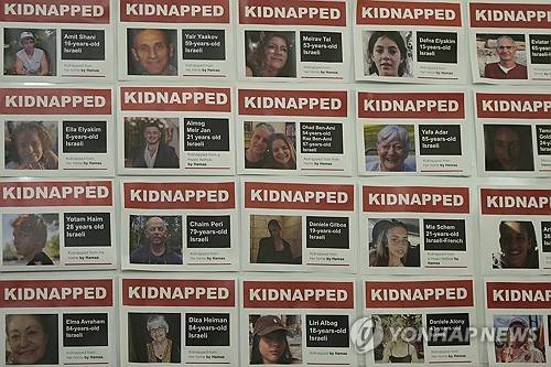 Photographs of hostages taken after the Oct. 7 assault by Hamas militants, are displayed at a news conference at the Israel Embassy in London, Monday, Nov. 20, 2023. More than 200 Israelis and foreigners were taken hostage on Oct. 7 after Hamas militants infiltrated Israel. (AP Photo/Kin Cheung)