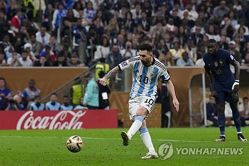 FILE - Argentina's Lionel Messi scores the opening goal from the penalty spot during the World Cup final soccer match between Argentina and France at the Lusail Stadium in Lusail, Qatar, on Dec. 18, 2022. Sotheby's is to auction off six first half shirts worn by Lionel Messi during Argentina's winning run at the soccer World Cup in Qatar in 2022, including the one in the final, and thinks they could become the most valuable collection of sports memorabilia ever sold at potentially more than $10 million. (AP Photo/Natacha Pisarenko, File) FILE PHOTO