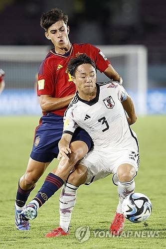 epa10985986 Keita Kosugi of Japan (R) in action against Quim Junyent Casanova of Spain (L) during the FIFA U-17 World Cup round of sixteen match between Spain and Japan at the Manahan Stadium in Surakarta, Indonesia, 20 November 2023. EPA/MAST IRHAM