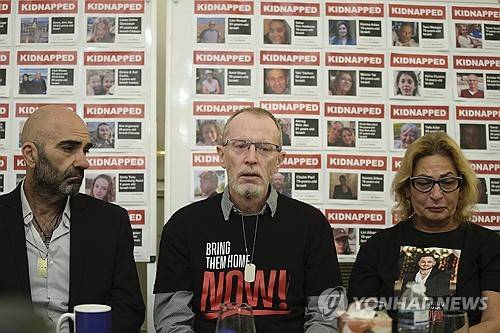 Thomas Hand, center, father of 9 year old hostage Emily Hand, and Orit Meir, right, mother of hostage Almog Meir, attend a press conference of families of hostages taken after the Oct. 7 assault by Hamas militants, at the Israel Embassy in London, Monday, Nov. 20, 2023. (AP Photo/Kin Cheung)