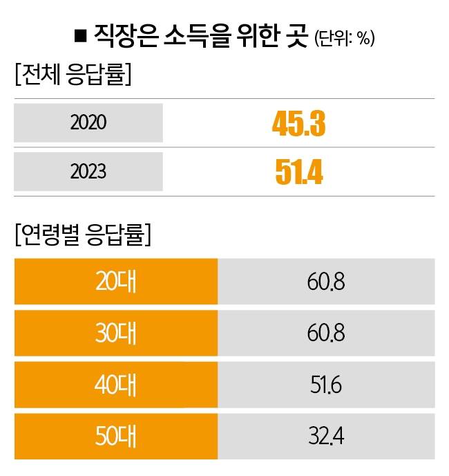 이같은 인식은 연령대에 따라 차이가 컸다. 20대와 30대 직장인 중 직장은 소득을 위해 다니는 곳이라고 말한 응답자 비중은 각각 60.8%로 같았고, 40대는 51.6%, 50대는 32.4%였다.