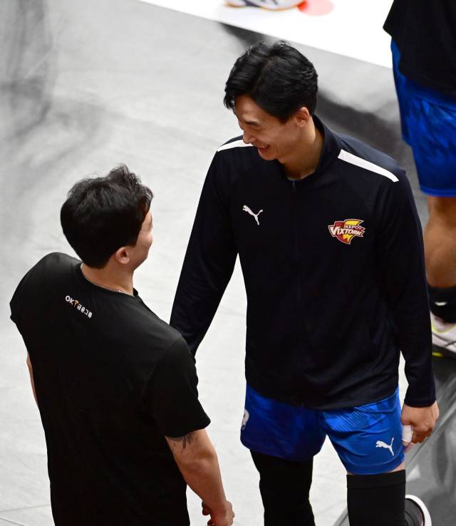 [한국전력 박철우, 타이스가 OK금융그룹 황동일 코치와 반갑게 인사했다 / KOVO(한국배구연맹)]