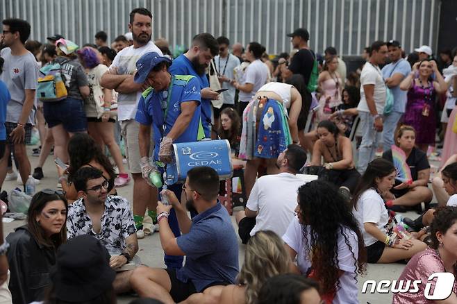 (리우데자네이루 로이터=뉴스1) 정지윤 기자 = 브라질 리우데자네이루의 기록적인 폭염에 20일(현지시간) 대기하고 있는 관객들의 행렬 사이로 직원이 물을 배부하고 있다. 2023.11.21