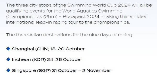아시아권에서 열리는 내년 경영 월드컵 1차 대회는 10월 18~20일 중국 상하이에서, 2차 대회는 24~26일 인천 문학박태환수영장에서, 마지막 3차 대회는 31일부터 11월 2일까지 2025 제22회 세계수영선수권 개최지인 싱가포르에서 열린다.
