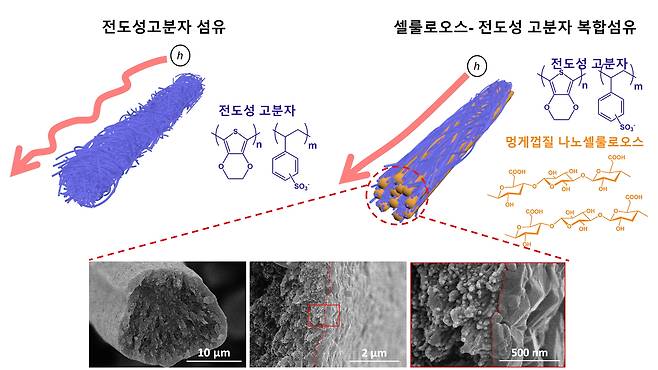 이러한 한계를 극복하기 위해 연구팀은 높은 결정성과 방향성을 갖는 셀룰로오스 나노섬유(cellulose nanofiber; CNF)와 대표적인 전도성 고분자로서 유기물 전기화학 트랜지스터 활성층으로 각광을 받고 있는 전도성 고분자 물질(PEDOT:PSS)을 복합화해 분자 수준에서 한 방향으로 고도로 정렬시킴으로써 기계적 유연성과 우수한 전기·전기화학적 특성을 겸비한 소재를 개발하는 데 성공했다.