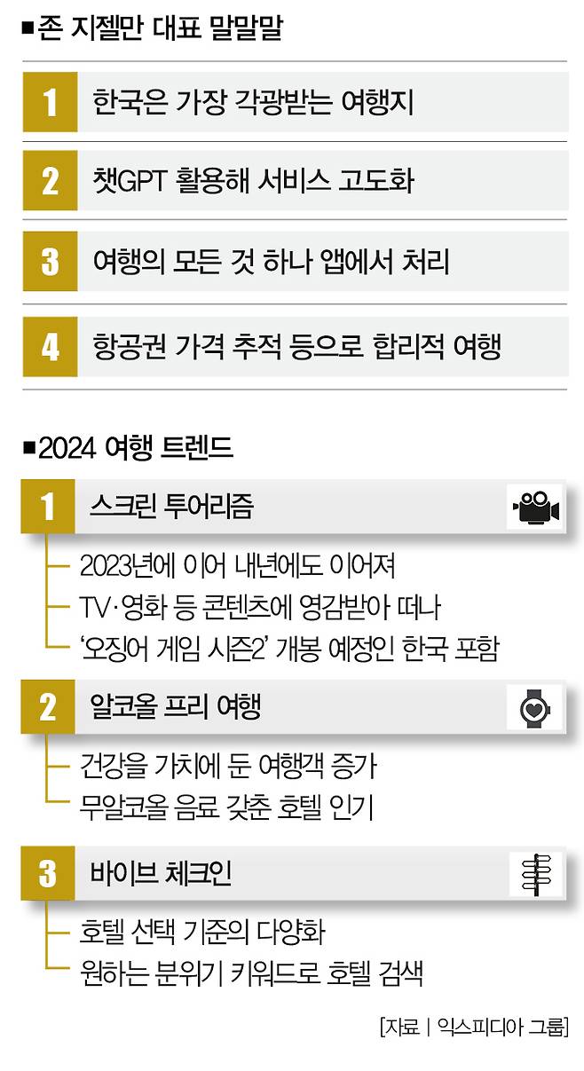 "무엇보다 스크린 투어리즘 트렌드가 이어질 것으로 예상합니다. 내년 넷플릭스 콘텐츠 '오징어 게임 시즌2'가 출시되는 만큼 한국은 스크린 투어리즘 인기 여행지 중 하나로 꼽혔죠. 이외에도 넷플릭스 콘텐츠 '브리저튼'의 배경인 영국 런던·바스, 영화 '아가일'의 촬영지인 '그리스' 등이 있습니다."