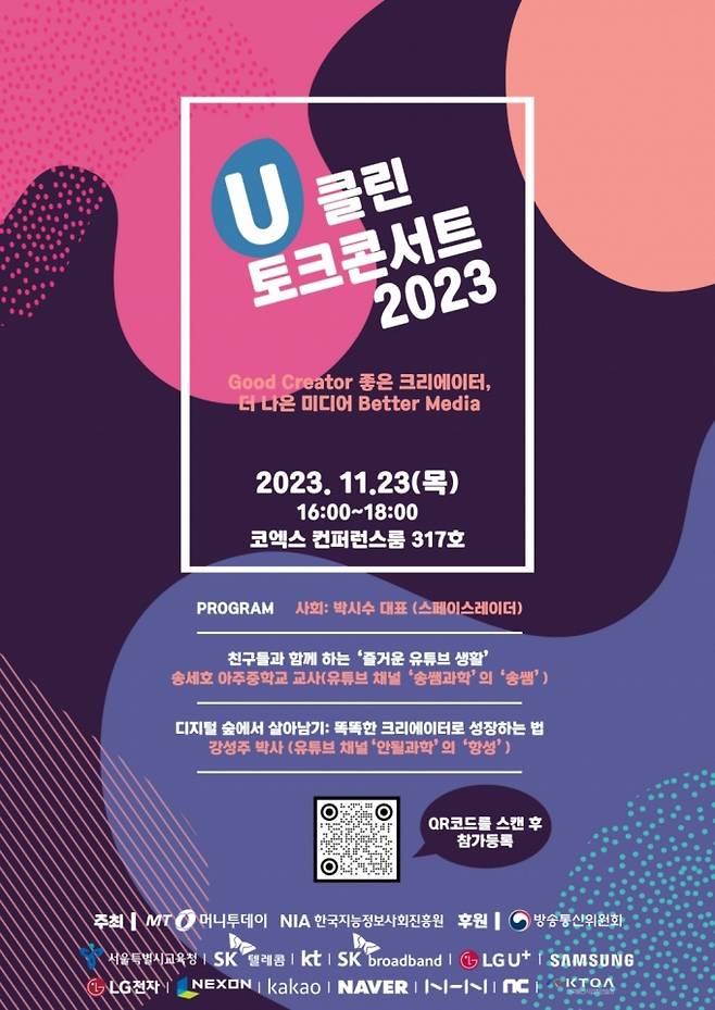 머니투데이와 한국지능정보사회진흥원(NIA)이 주최하고 방송통신위원회가 후원하는 u클린 토크 콘서트는 '좋은 크리에이터, 더 나은 미디어(Good Creator, Better Media)'를 주제로, 1인 미디어의 크리에이터와 소비자의 바람직한 '미디어 리터러시' 확립 방안을 알린다.