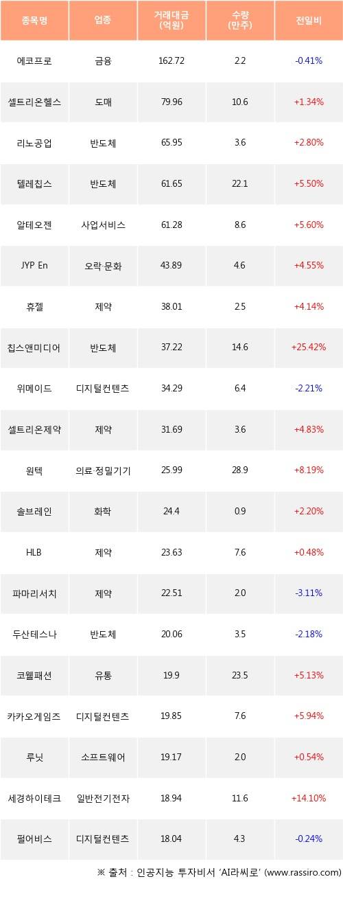 외국인 투자자의 순매수 상위 20개 종목은 에코프로, 셀트리온헬스케어, 리노공업, 텔레칩스, 알테오젠, JYP Ent., 휴젤, 칩스앤미디어, 위메이드, 셀트리온제약등이다.