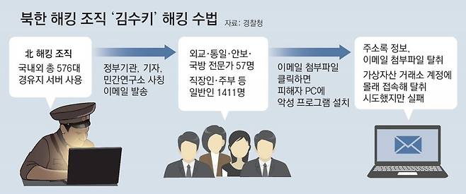 경찰청 국가수사본부는 21일 브리핑을 열고 “김수키의 활동 내용을 추적해 수사한 결과 해킹 공격 대상을 외교안보 분야 공무원과 전문가뿐만 아니라 일반인까지 확대한 것으로 나타났다”며 이같이 밝혔다.