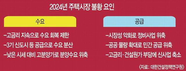 대한건설정책연구원(건정연)이 21일 세미나 형식으로 발표한 ‘2024년 건설·주택 경기 전망’을 보면 내년 주택시장은 수요와 공급 모든 측면에서 활황을 기대하기 어려운 상황이다. 정부가 부동산 규제를 풀었지만 고금리와 물가 상승세 지속 등으로 집을 짓는 쪽이나 사려는 쪽이나 모두 움츠러들 가능성이 크기 때문이다.