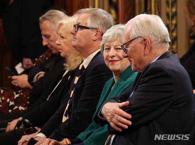 [런던=뉴시스] 전신 기자 = 테리사 메이(오른쪽 두번째) 전 영국 총리가 21일(현지시간) 런던 영국 의회에서 영국을 국빈 방문 중인 윤석열 대통령의 연설을 경청하고 있다. 2023.11.22. photo1006@newsis.com