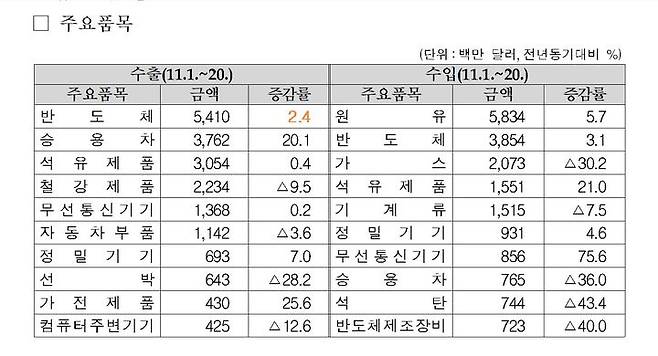 품목별 수출액은 전년 동월 대비 승용차(20.1%)와 가전제품(25.6%) 등에서 강세를 보였다. 정밀기기(7.0%)와 석유제품(0.4%), 무선통신기기(0.2%) 등도 1년 전보다 늘었다. 그동안 정보기술(IT)수요 감소로 주춤하던 반도체 수출이 2.4% 증가했다.