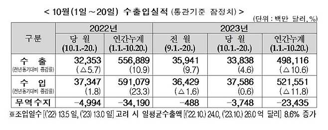 수출은 소폭 증가하고 수입은 그보다 더 줄었지만, 수입액이 더 큰 이유로 무역수지는 14억1600만 달러(약 1조8238억원) 적자가 났다.