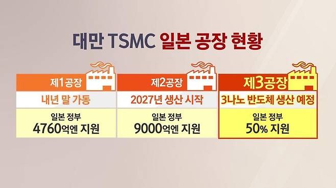 기자가 콕 짚어 전하는 뉴스, 뉴스픽입니다. 세계 최대 반도체 파운드리업체 대만 TSMC가 일본에 3번째 공장 건설을 추진합니다. 일본이 단숨에 최첨단 반도체 생산 허브로 부상할 수 있는데요. 우리 삼성전자와 SK하이닉스 등 반도체 기업의 행보가 주목됩니다. 윤지혜 기자, TSMC가 기존의 반도체 1공장과 2공장에 이어, 일본에 세 번째 공장 설립을 검토 중이군요?