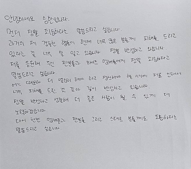 [스포츠조선닷컴 이게은기자] 사생활 논란에 휩싸인 그룹 라이즈 승한이 활동을 무기한 중단한 가운데 팬들에게 자필 편지로 사과했다.